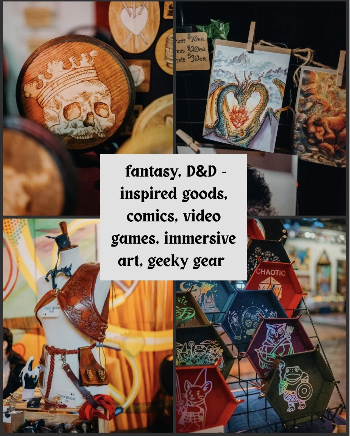 Wander the Vendor Halls, filled with sci-fi and medieval art, geeky gear, wire-wrapped elf ears, leather wearables, tabletop gaming accessories, chainmail, potions, handcrafted crowns, dragon eggs, and renaissance-inspired wares. Meet local fantasy authors, get inked with themed flash tattoos, and fuel up at the cash bar with bites from Madeline’s Catering while you explore everything ARTISANworks has to offer. By dressing the part, come ready — prizes will be awarded throughout the day for standout looks. Whether you arrive as a battle-ready warrior, forest guardian, rogue, mage, or something entirely your own, your effort will not go unnoticed.