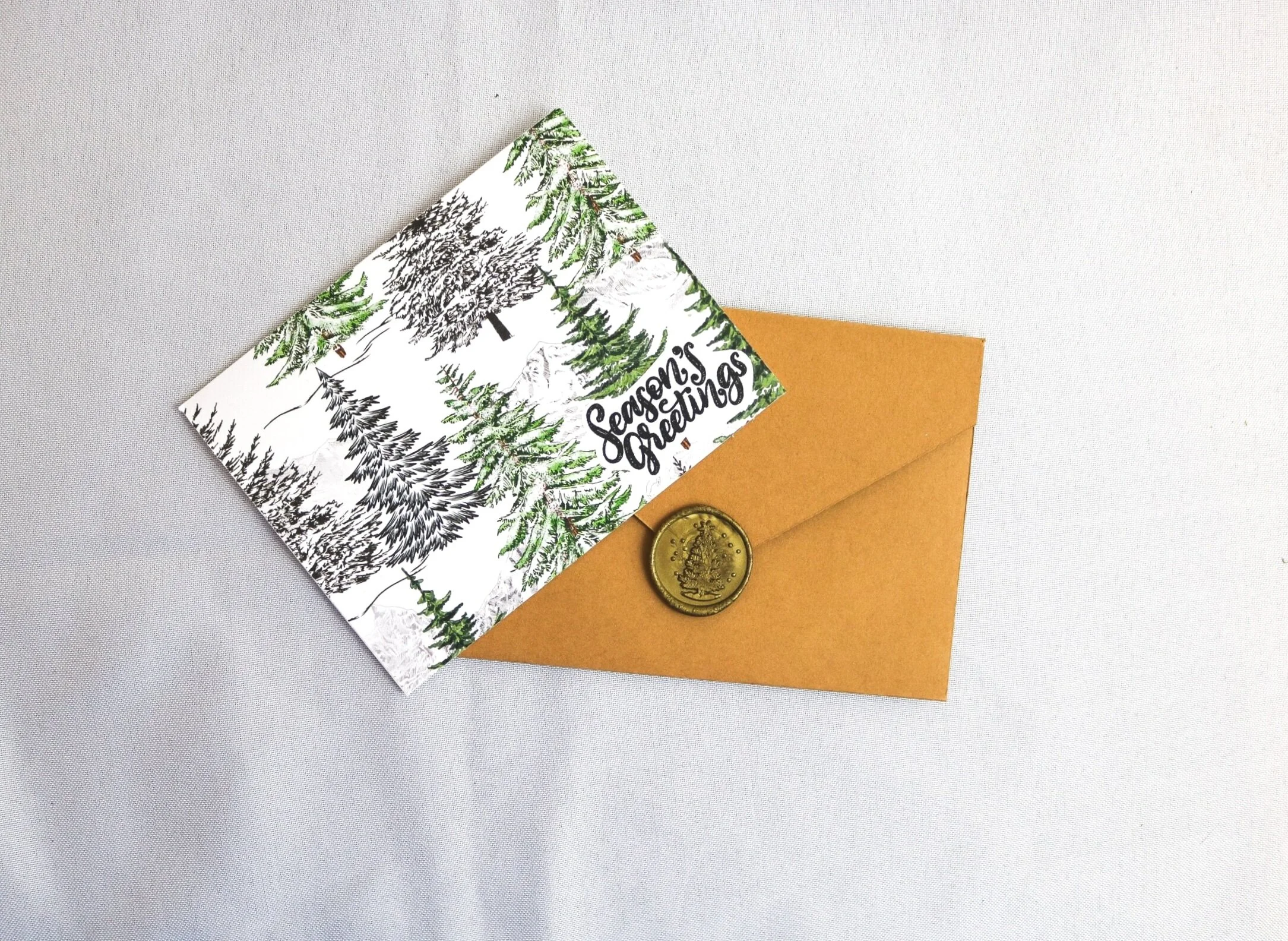 This 8 count letter set is made from handmade recycled papers. Accented with a “Season’s Greetings” decal, paired with matching white envelopes to offset the green pine tree card, finish with your personal message (empty interior). These handcrafted cards and envelopes will bring a smile to anyone lucky enough to receive them.